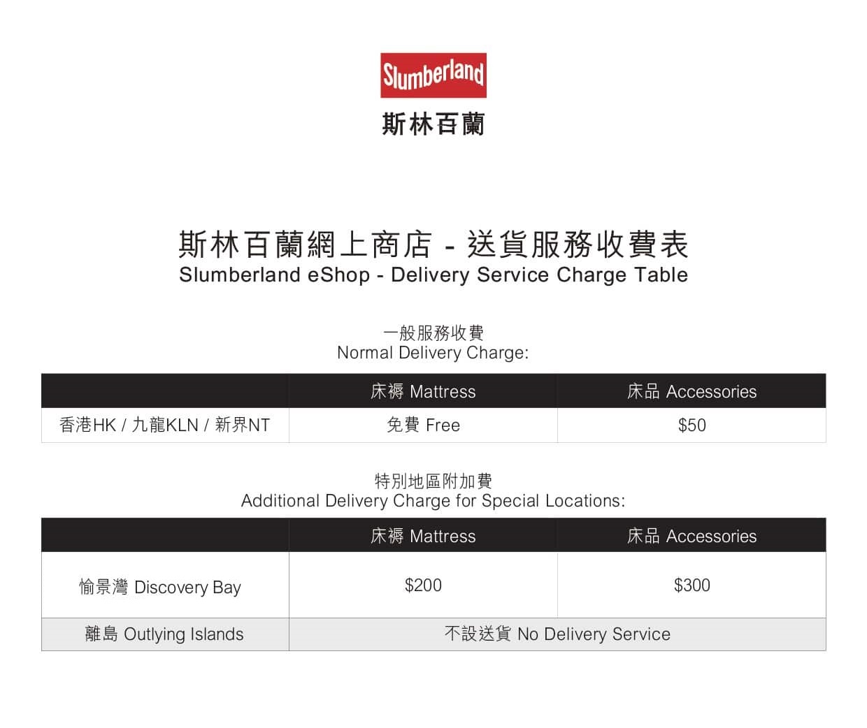 - 送貨範圍僅限於香港島、九龍及新界區。愉景灣須收取附加送貨費,有關收費請參考「網上商店送貨收費表」及「其他特別服務收費表」。離島、村屋、距離停車地方甚遠、唐樓、沒有升降機直達的地點及PO Box地址不設送貨。